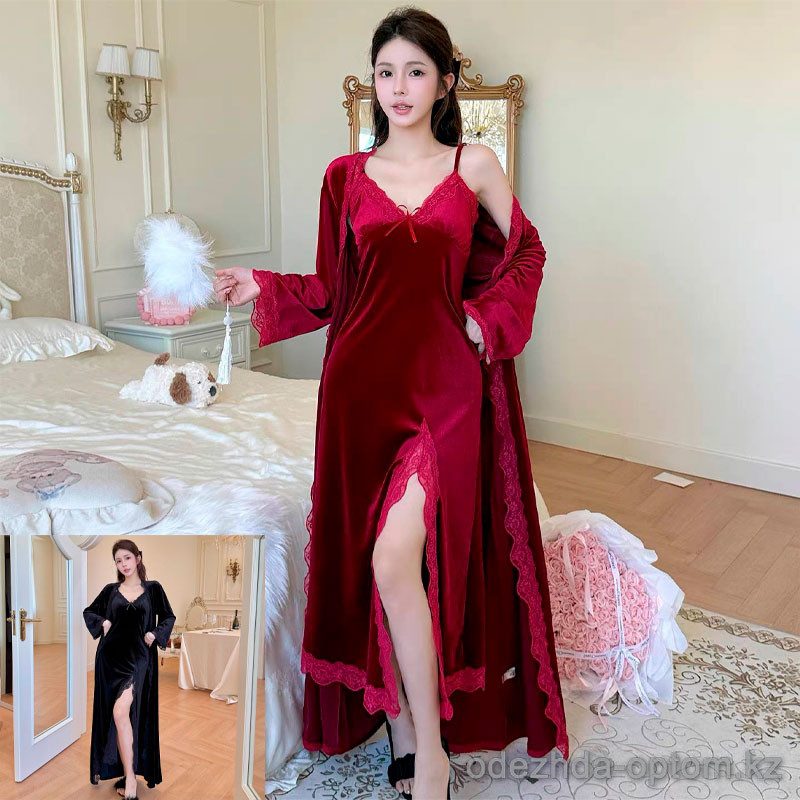 b15-126 Сорочка женская велюровая в комплекте с халатом, M-XL, 1 пачка (3 шт)