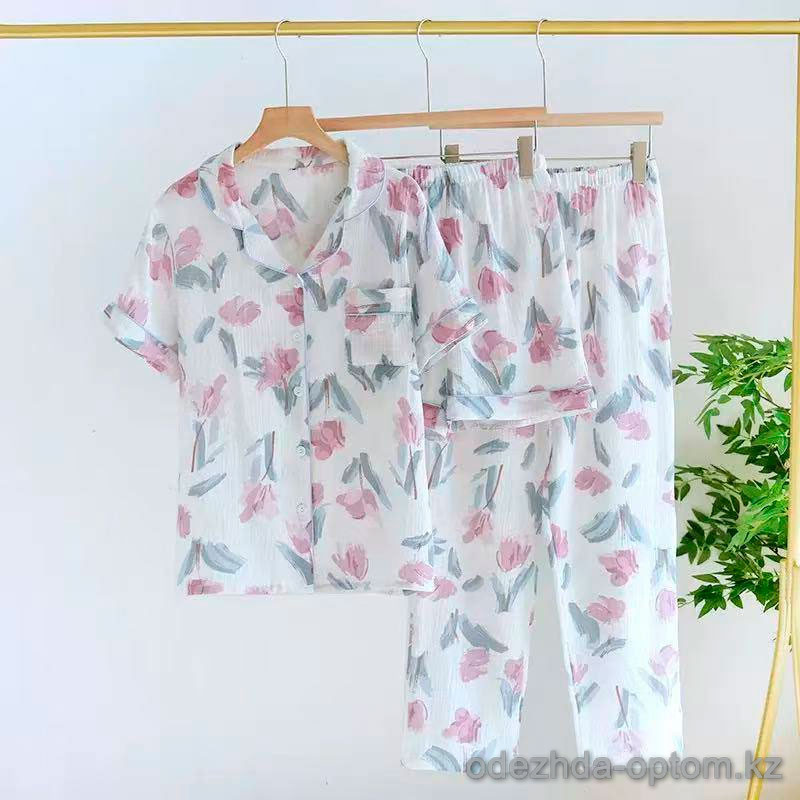 b15-303-19 Комплект женской муслиновой пижамы 3в1: рубашка, шорты и штаны, M-XL, 1 пачка (3 шт)